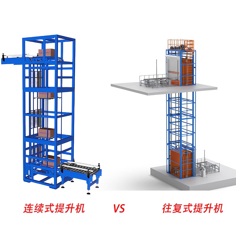 連續(xù)式提升機(jī)和往復(fù)式提升機(jī)是自動(dòng)化物流系統(tǒng)中常見的垂直輸送設(shè)備,但它們?cè)诮Y(jié)構(gòu)、效率、適用場(chǎng)景等方面存在顯著差異。本文將從多個(gè)維度進(jìn)